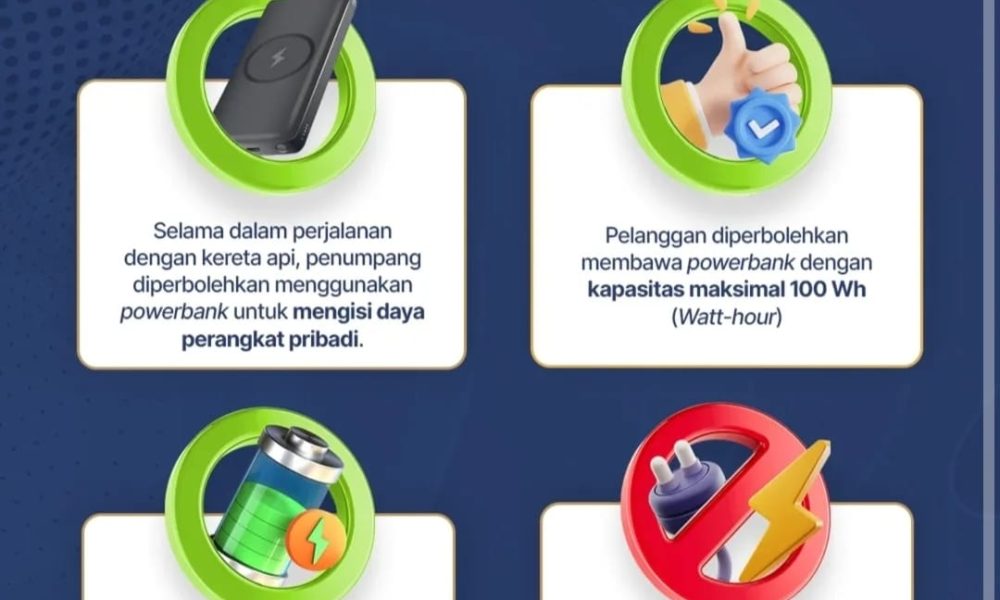 Kabar-kini.com, Jakarta, 23 Oktober 2025 – PT Kereta Api Indonesia (Persero) Daerah Operasi 1 Jakarta mengimbau kepada seluruh pelanggan agar memperhatikan ketentuan terbaru terkait membawa dan menggunakan _Powerbank_ selama dalam perjalanan dengan kereta api. Kebijakan ini diberlakukan untuk memastikan aspek keselamatan, keamanan, dan kenyamanan bersama selama perjalanan.
