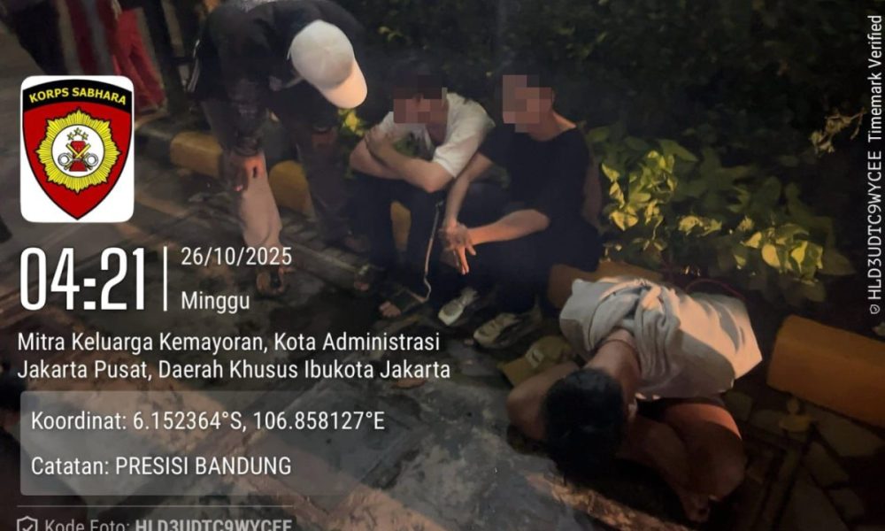 Jakarta Pusat — Tiga pemuda diamankan petugas Patroli Perintis Presisi Polres Metro Jakarta Pusat saat diduga hendak melakukan tawuran di kawasan Sunter Kemayoran, Jakarta Pusat, Minggu (26/10/2025) dini hari. Dari tangan para pelaku, polisi menyita dua bilah celurit dan satu petasan yang diduga akan digunakan dalam aksi tersebut.