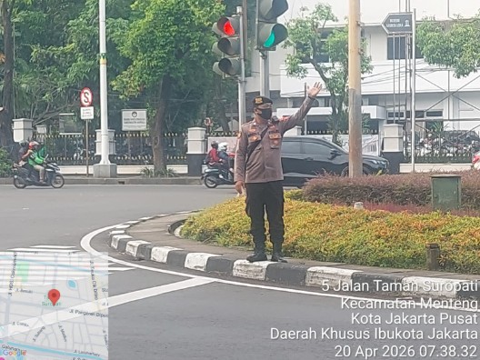 Jakarta Pusat – Kepadatan arus lalu lintas pada jam sibuk pagi di kawasan Menteng, Jakarta Pusat, berhasil diantisipasi berkat kehadiran personel Patroli Motor (Patmor) Polsek Metro Menteng Aiptu Andri Yatmoko yang melaksanakan pengaturan arus lalu lintas di persimpangan Traffic Light (TL) Taman Suropati–Jalan Diponegoro. Kegiatan ini dilakukan guna memastikan kelancaran mobilitas masyarakat, terutama saat siswa berangkat sekolah, karyawan menuju kantor, dan warga memulai aktivitas harian. Senin (20/4/2026)
